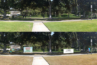 In art student Kathleen Deck's "Conservation Through Creation” art installation, a section of lawn won’t be watered for a month. The idea is to return an artificial environment to its natural state, and start a discussion about how the changing climate can affect water use and the fragile environment that people have created. Deck is one of 37 UC Carbon Neutrality Initiative Fellows.