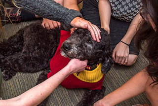 The Student Health Center within the university's Office for Wellness and Health Promotion hired its first, full-time wellness dog trained to work with a multitude of people on a regular basis. Research suggests that positive interactions with dogs can create a sense of calm and well-being, and can help remove barriers for students around accessing resources at the student center.