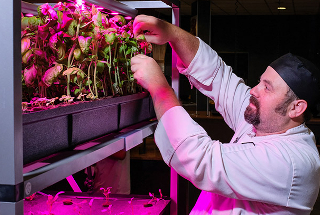 Chefs in Boozel Dining Hall can now use fresh herbs and vegetables in their daily menu thanks to a new indoor, soilless growing system. The hydroponic garden was installed in partnership with a business that focuses on indoor gardening and STEM education for restaurants and institutional dining halls.