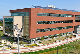 Opened in fall 2013, the 230,000-square-foot building features a geothermal-well installation, windows and shades that optimize daylight and energy savings, a vertical wind turbine and rooftop solar panels that tie in to the building, water bottle filling stations, small roof gardens and four stormwater retention basins.