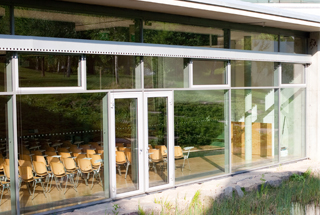 The new building, previously the site of a roller rink, includes an atrium featuring living fig trees and a wooden wall made from the roller rink's wood flooring, natural daylighting, a heat recovery system to aid in energy efficiency, and reclaimed materials.