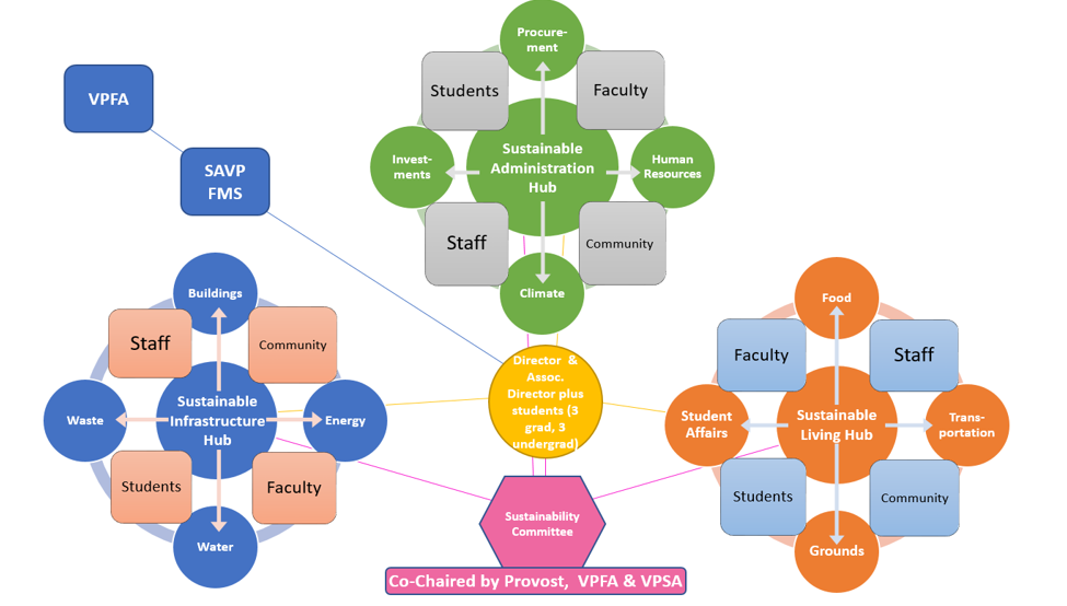 The new Sustainability Hubs advance initiatives in 12 thematic areas to further progress the university’s Sustainability and Climate Action Plans. The three, faculty-led hubs are the Sustainable Infrastructure Hub, focusing on buildings, energy, water and waste; the Sustainable Living Hub Coordinator concentrating on food, transportation, grounds and student affairs; and a hub focusing on climate, procurement, investments and human resources.
