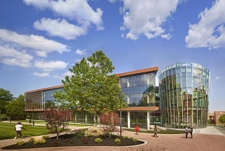 The university's Center for Natural Sciences, Mathematics and Nursing is a 149,000-square-foot, four-floor building that features dynamic glazed windows that tint on-demand to lower energy usage and a computerized and automated ventilation system for laboratories. Sloped landscaping prevents rainwater from running off onto paved surfaces, and native deciduous shade trees in the building's plaza serve as a natural buffer from the sun's rays.
