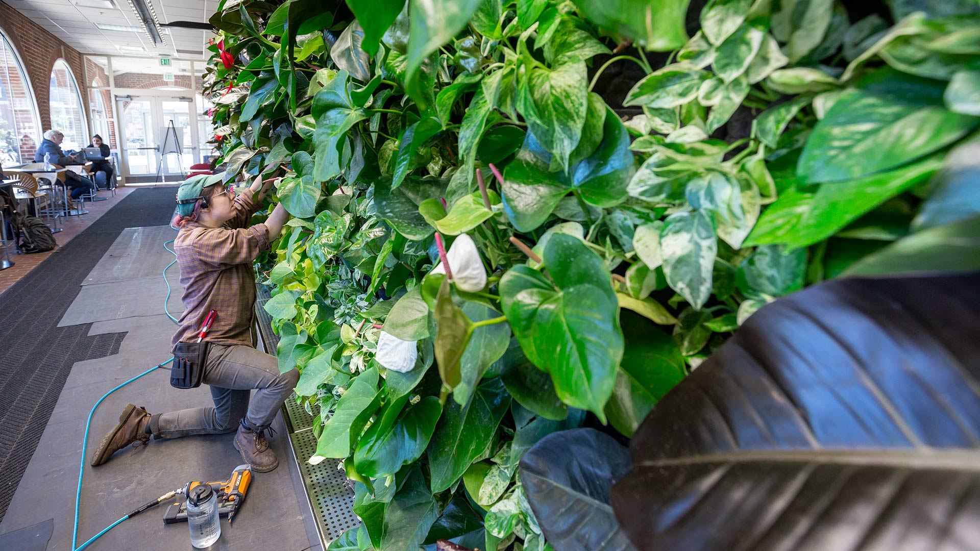 With the help of a University Sustainability Fund grant, students, faculty and staff can now reap the health and well-being benefits of a 240-square-foot, vertical garden installed on the ground-floor patio inside the Student Union.