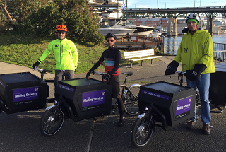 The university's Mailing Services now uses a fleet of electric-assist cargo bicycles to deliver nearly all mail to 455 departments on the Seattle campus. Mailing Services used a grant from the Campus Sustainability Fund to purchase five of the bikes. Since phasing out trucks, deliveries now take 10 percent less time and 30 percent fewer miles traveled.