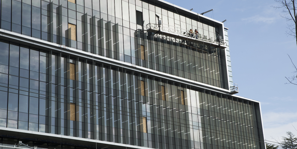 In an effort to reduce heat gain and use renewable energy in the university's Life Sciences Building, the building, which is still under construction, will feature vertical glass fins that include embedded photovoltaic cells along the south side of the building.