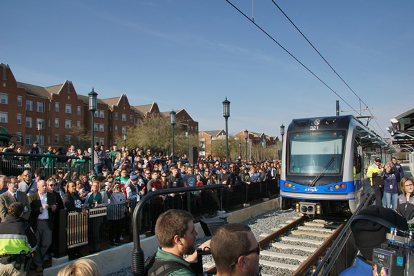 The 9.3-mile stretch of extended light rail tracks offers 11 new stations providing service to the university’s main and uptown campuses. The campus added sidewalks, crosswalks, and bus stations to support pedestrian traffic from stations. For the station on the edge of campus, the university funded a pedestrian bridge over a highway.