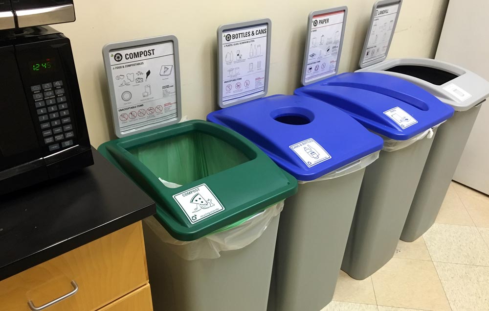 In an effort to increase the waste diversion percentage from 50 to 65, the pilot Zero Waste Workplace program, coordinated by the university’s Office of Waste Reduction and Recycling, uses composting stations, desk-side mini waste bins, and self-service recycling and landfill sorting stations in one the campus' administrative buildings, which houses University Housekeeping and the University Sustainability Office.