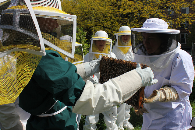 The university was named this spring as the 10th Bee Campus USA campus in the nation by Bee City USA for its commitment to minimize the use of harmful chemical pesticides and raise awareness of the plight of pollinators, including bees, which have suffered from colony collapse and die-offs in recent years due to chemicals in the environment. In an effort to improve the university’s urban ecosystem and provide an educational opportunity for the community, the Student Sustainability Center has installed two hives with as many as 100,000 honeybees near a community garden and orchard at the edge of campus.